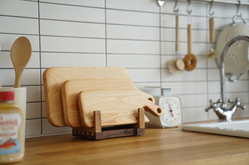하우트공방의 도마거치대는 두꺼운 원목 도마도